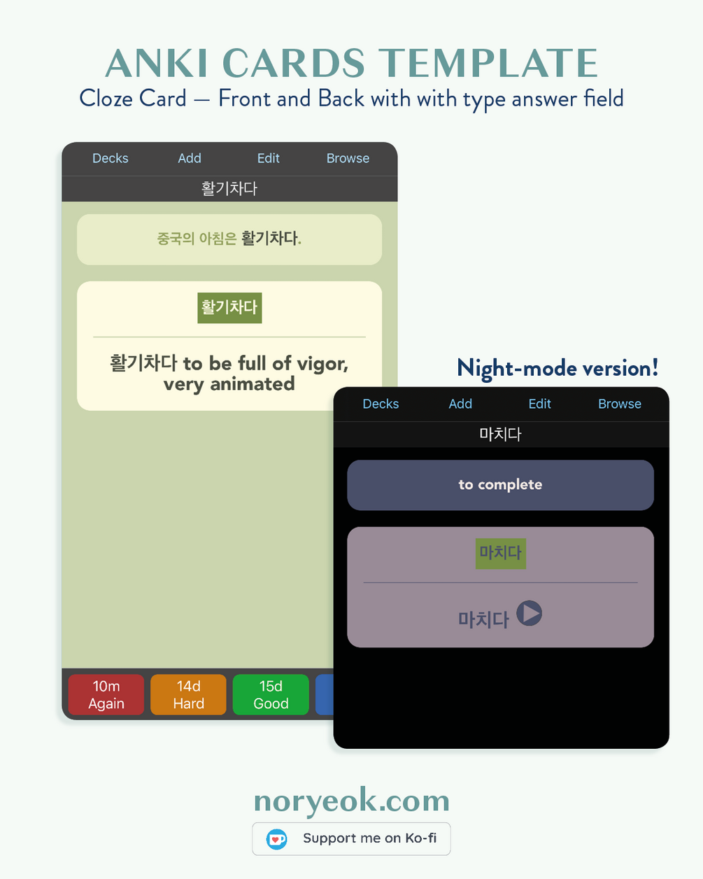 You will get the HTML and CSS to make your Basic (type in answer), Cloze (type in answer) and Basic (and reversed) cards look like it is shown in the images. It includes night-time mode for the three types of cards! Works in mobile and desktop. It also includes a little guide to show you how to set it up.
