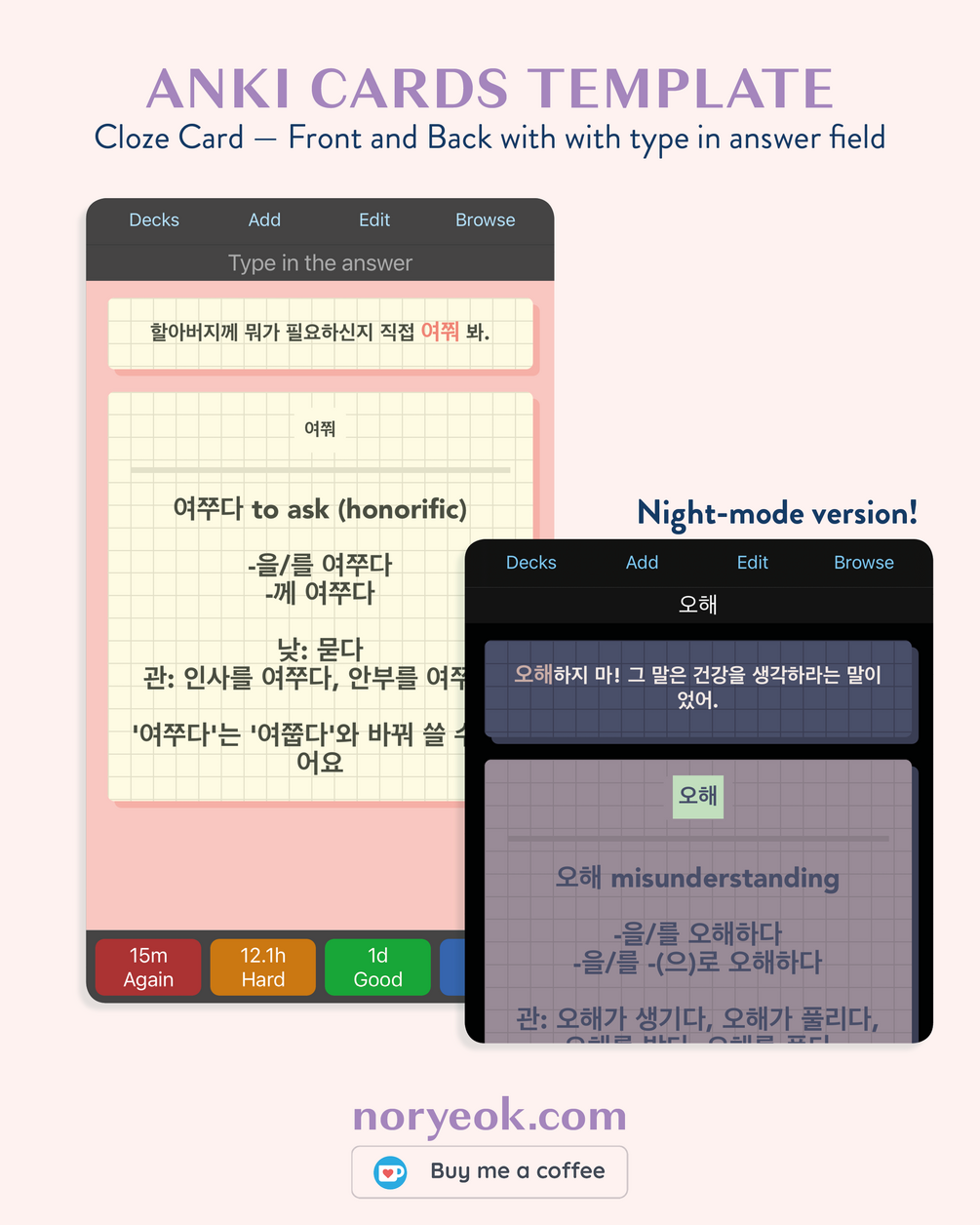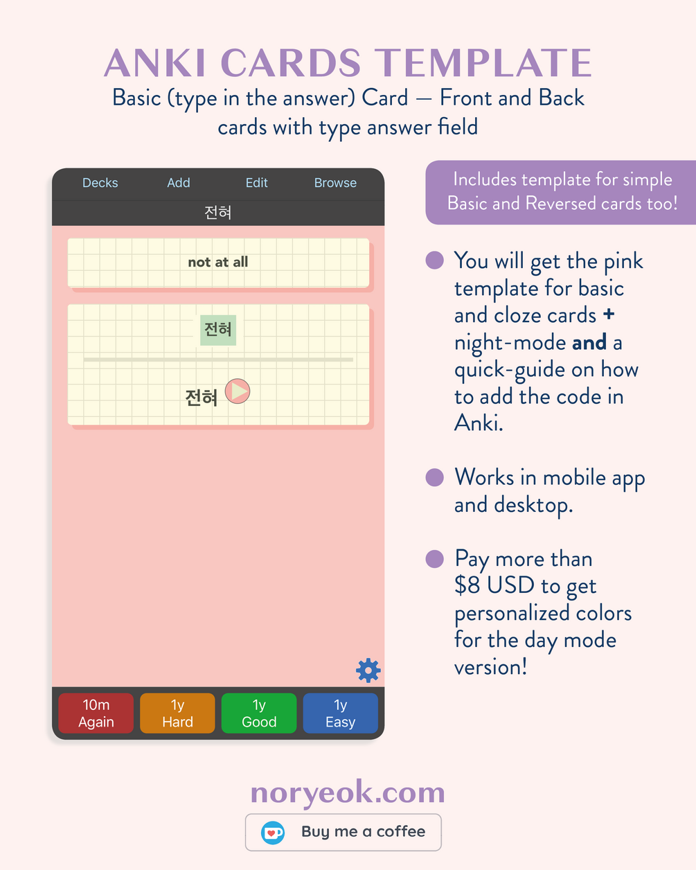 You will get the HTML and CSS to make your Basic (type in answer), Cloze (type in answer) and Basic (and reversed) cards look like pretty grid flashcards with a pink background. It includes night-time mode for the three types of cards!